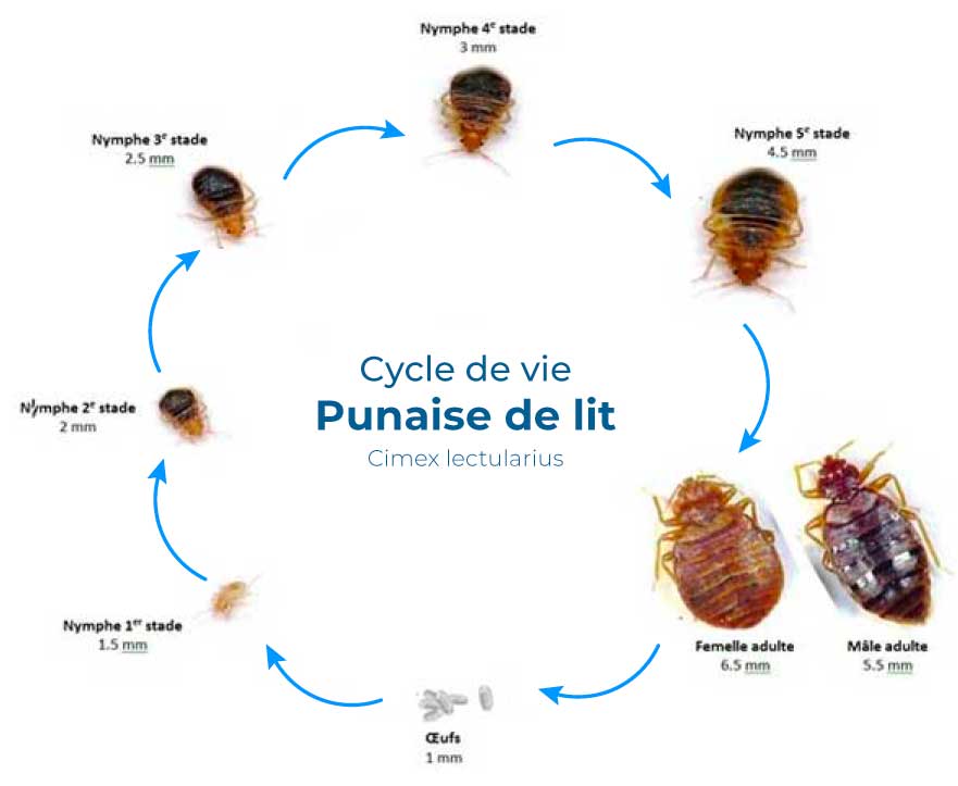 Le punaise de lit est capable de nous repérer grâce au gaz carbonique et à la chaleur que notre corps dégage. Les femelles adultes pondent 3 à 8 œufs par jour, allant jusqu’à 500 durant tout au long de leur vie. Les œufs éclosent sous 1 à 2 semaines (10 jours en moyenne) et les larves commencent à se nourrir aussitôt.